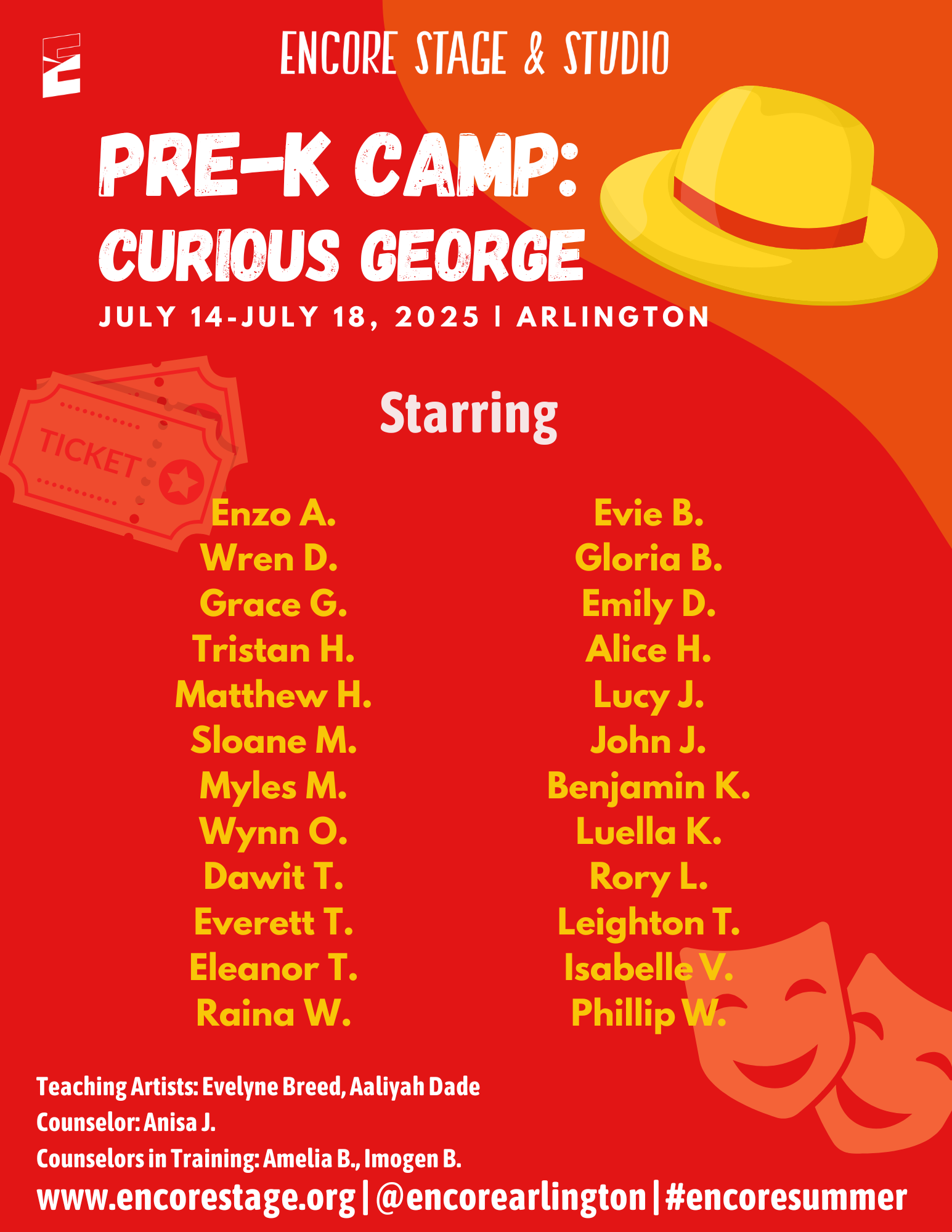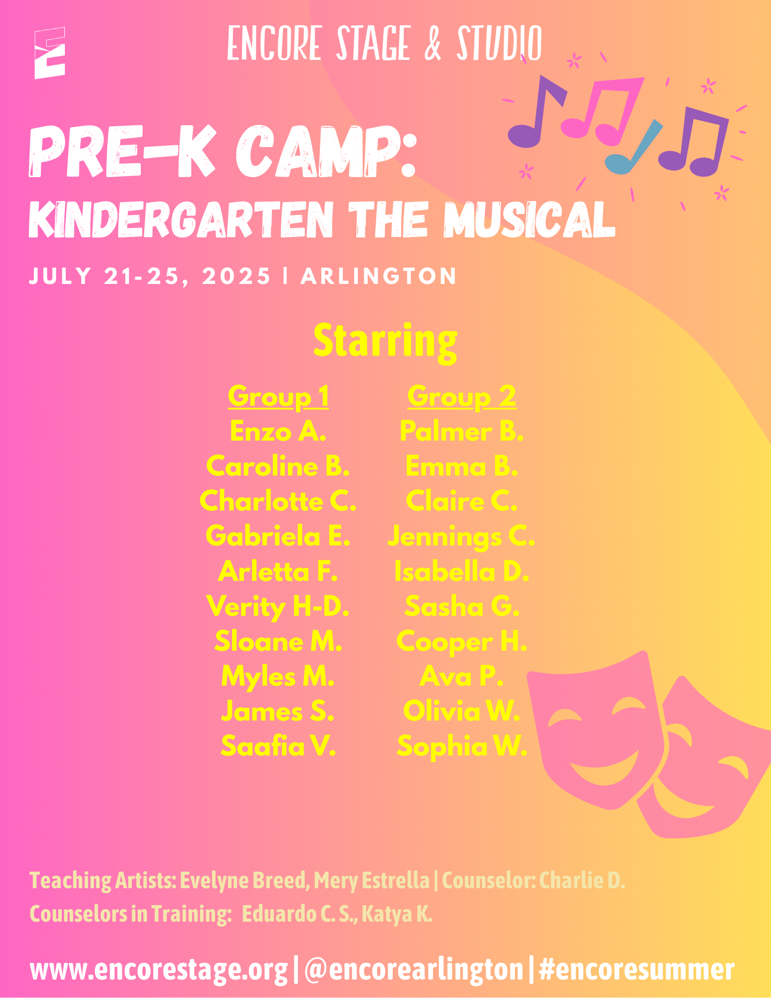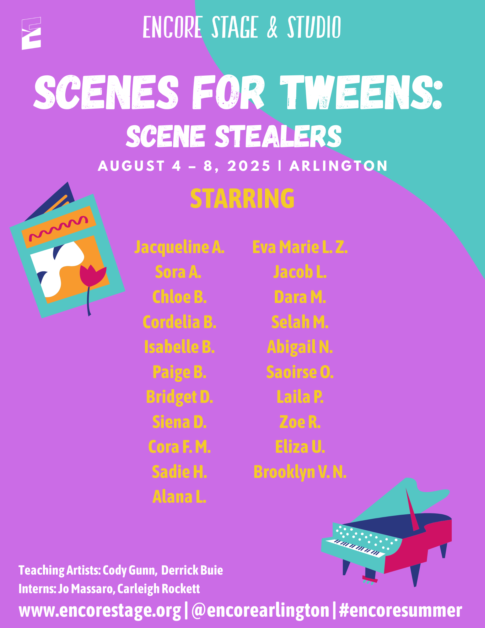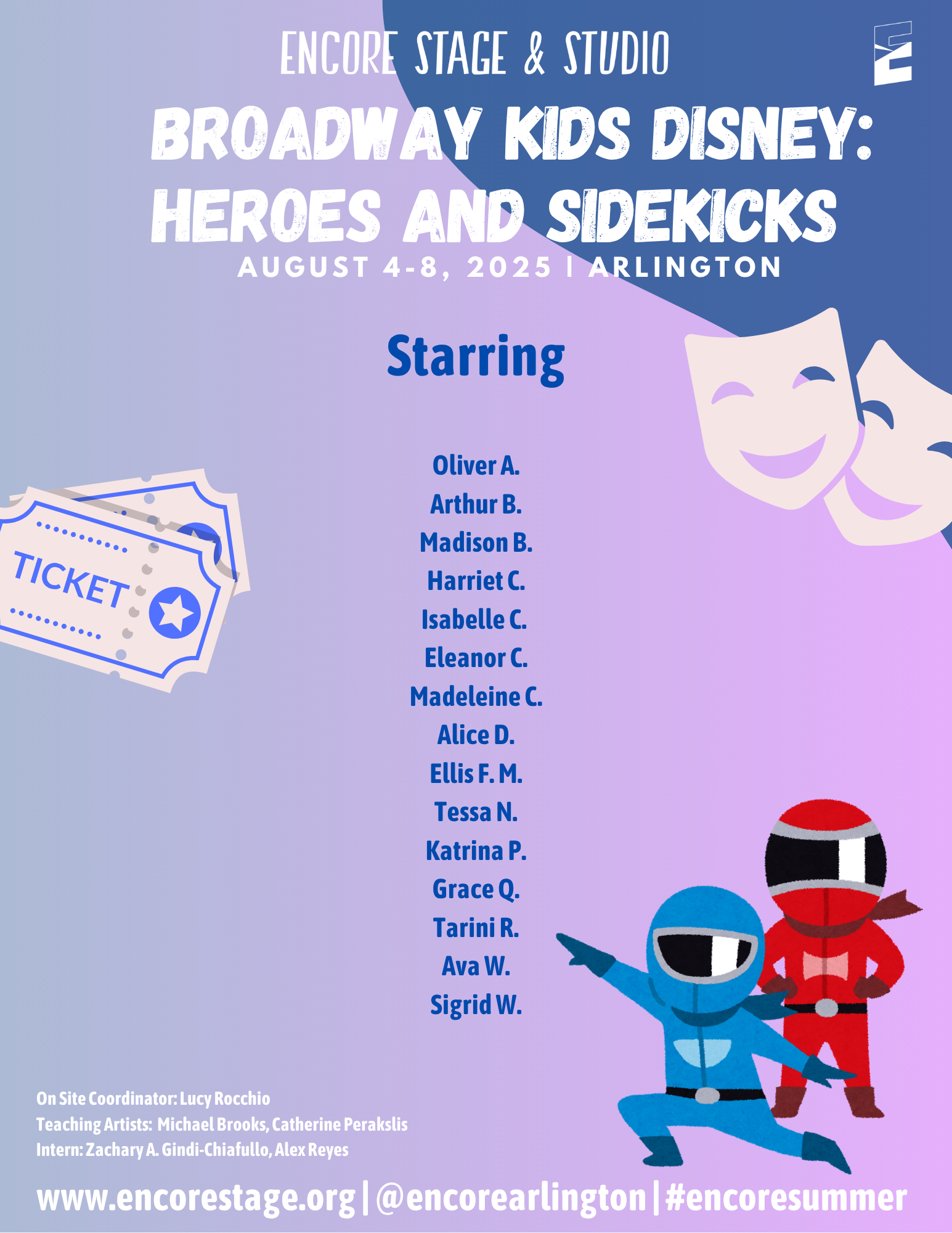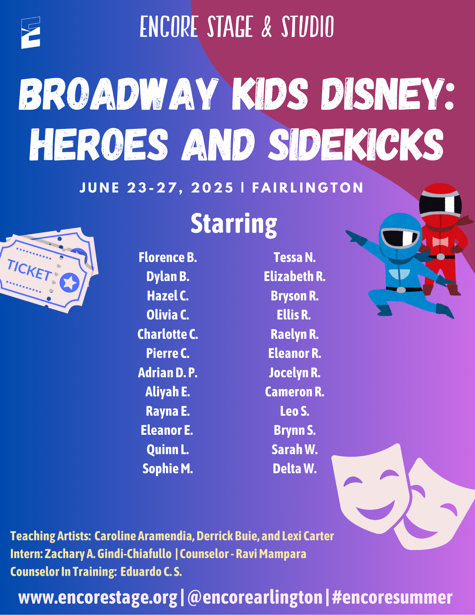 Discover the world of theatre through popular stories from the page and screen. Small groups of students will enjoy movement, theatre games, and crafts led by Encore’s Teaching Artists. We are excited to provide an opportunity for students to learn about theatre arts and activate their creativity!