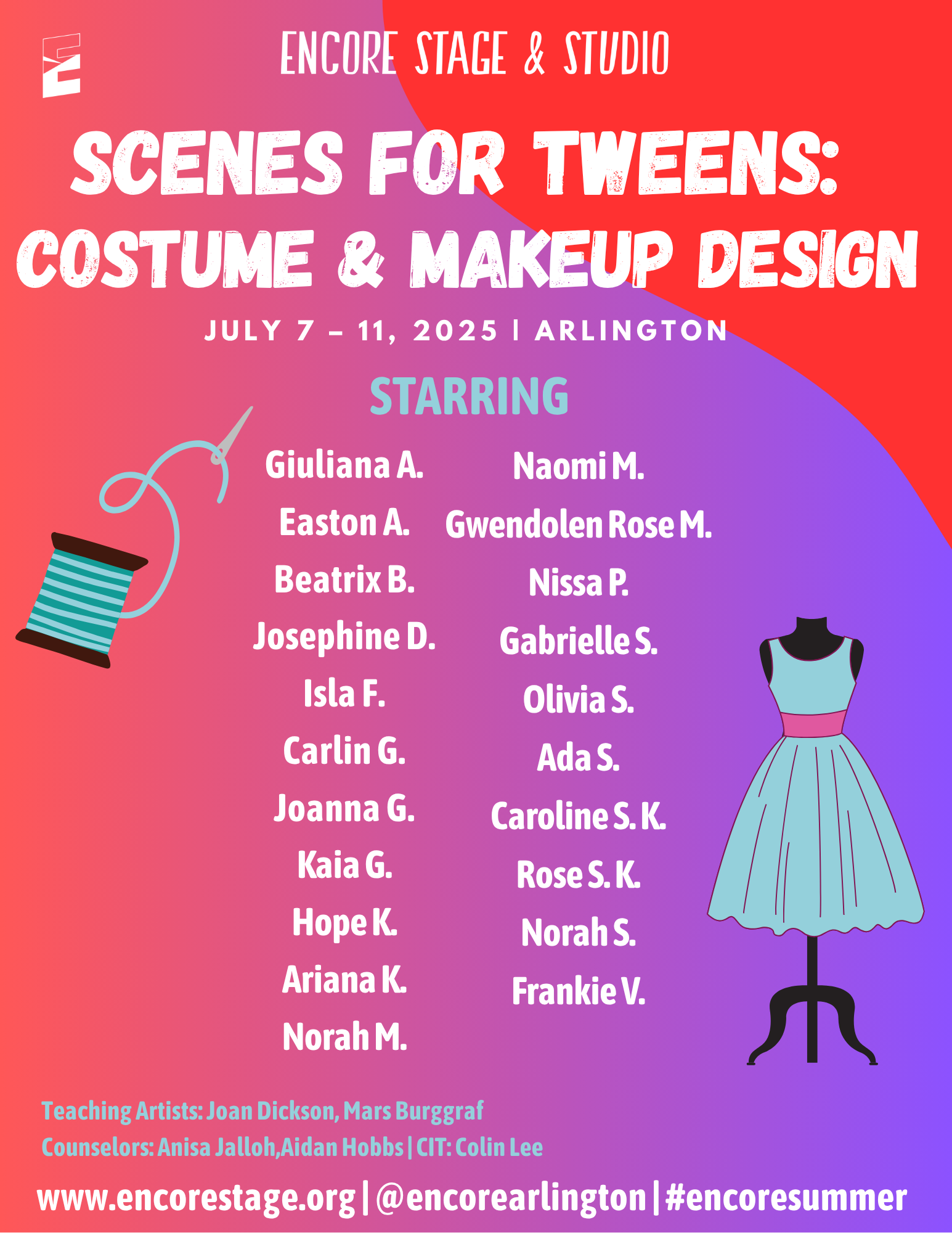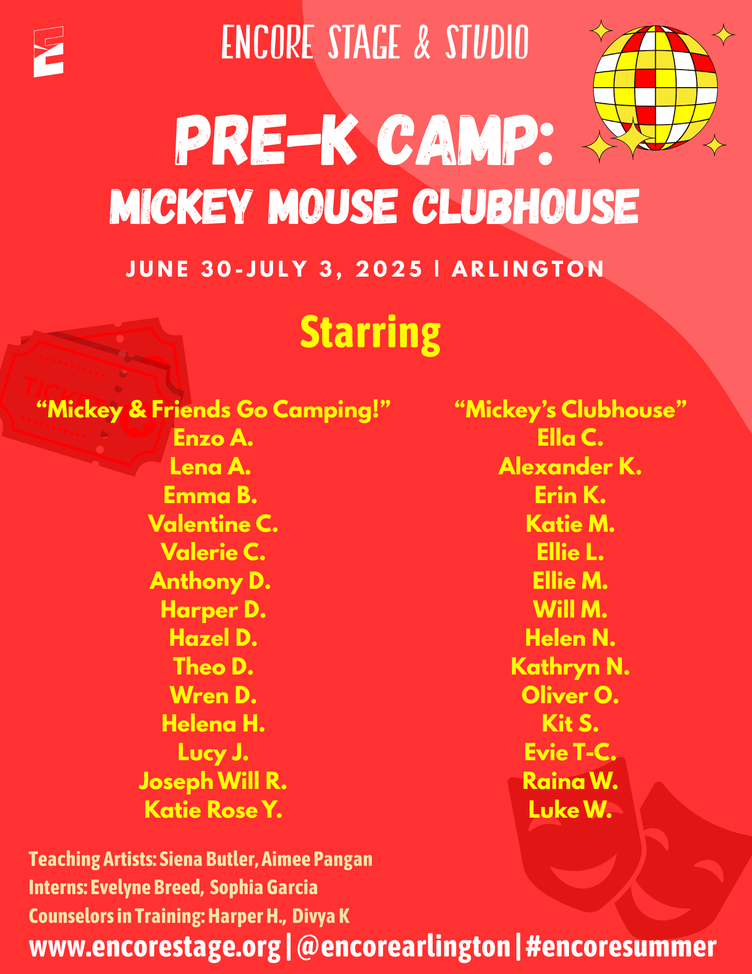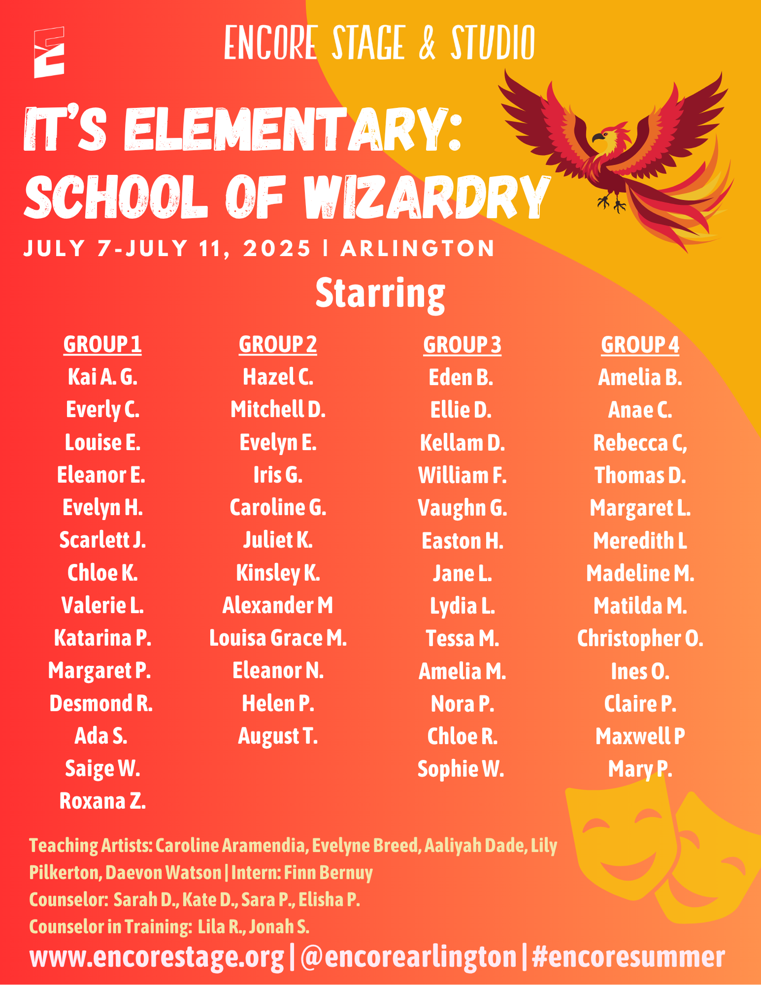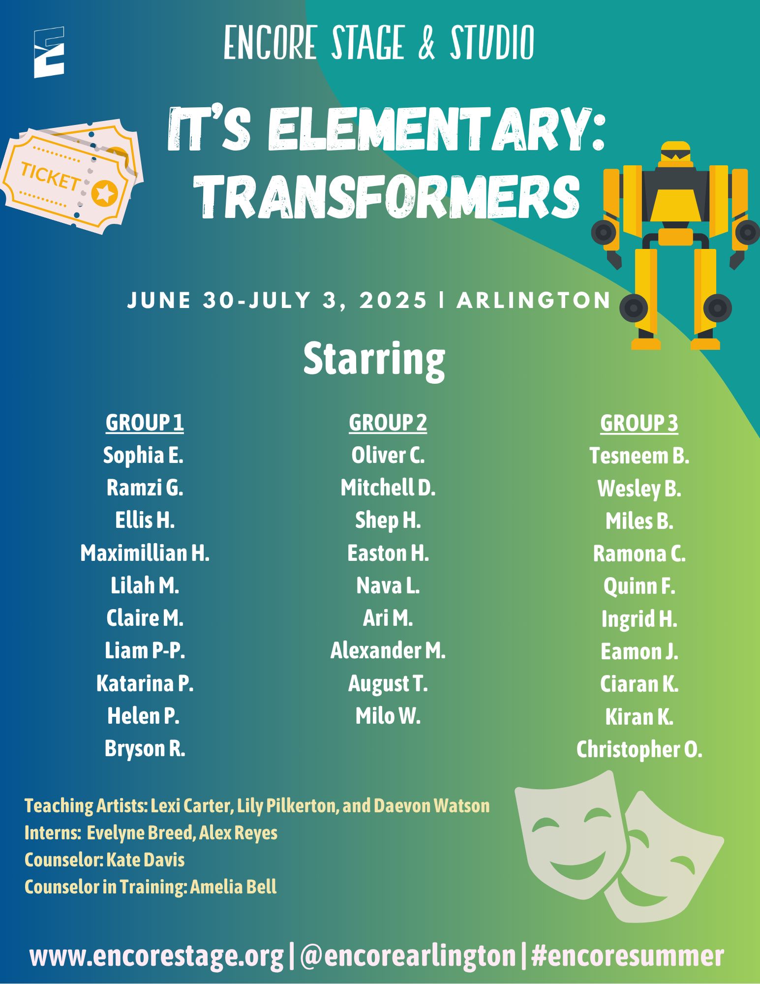 Discover the world of theatre through popular stories from the page and screen. Small groups of students will enjoy movement, theatre games, and crafts led by Encore’s Teaching Artists. We are excited to provide an opportunity for students to learn about theatre arts and activate their creativity!