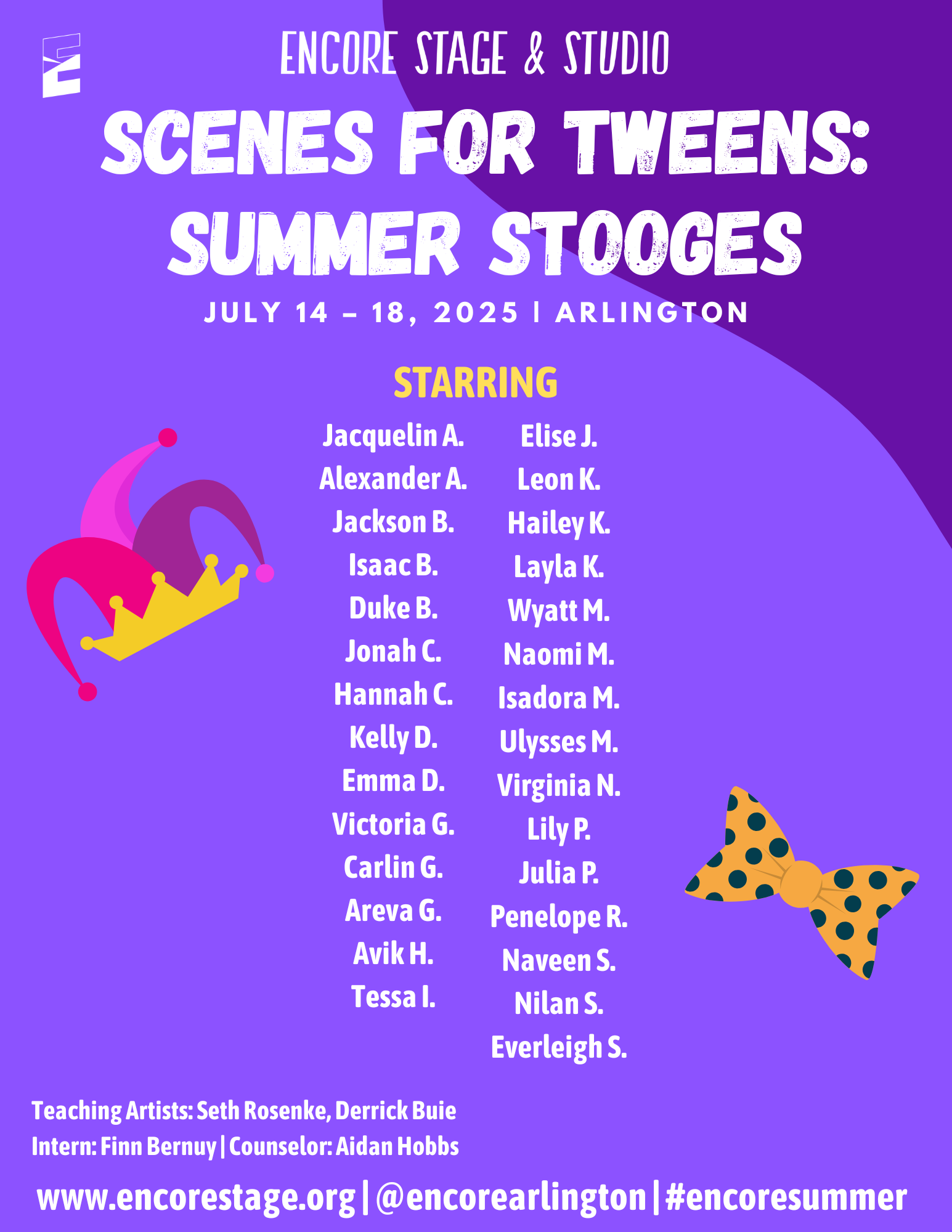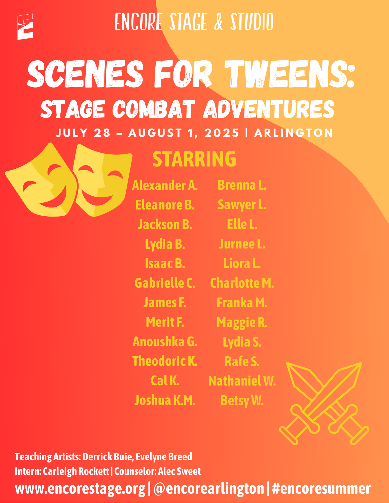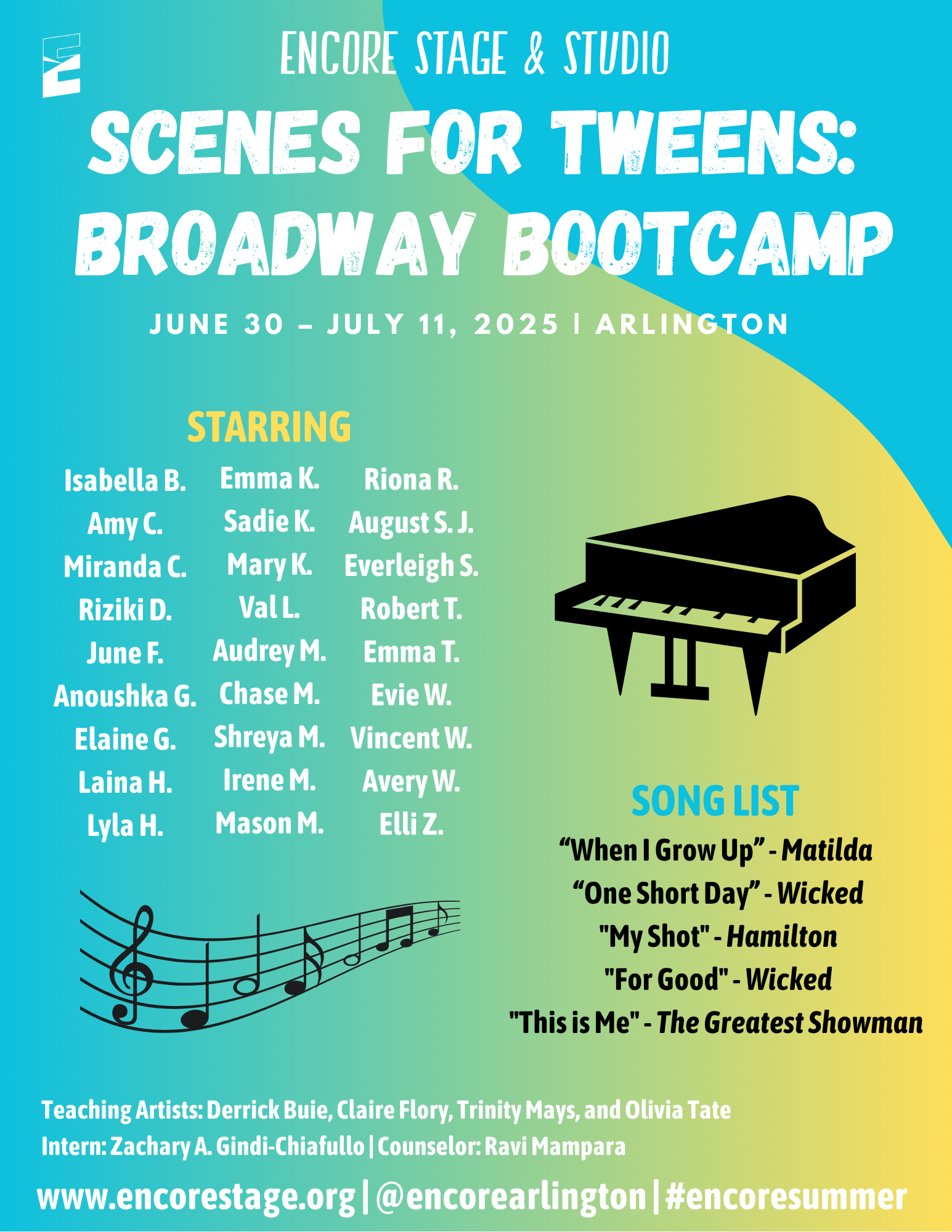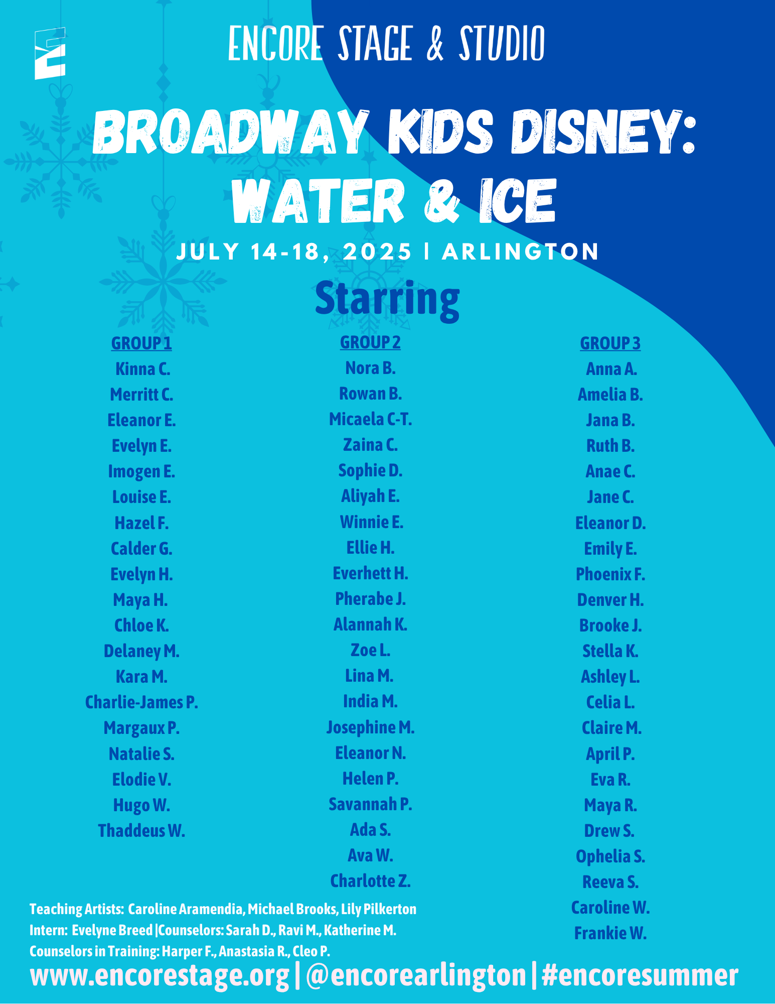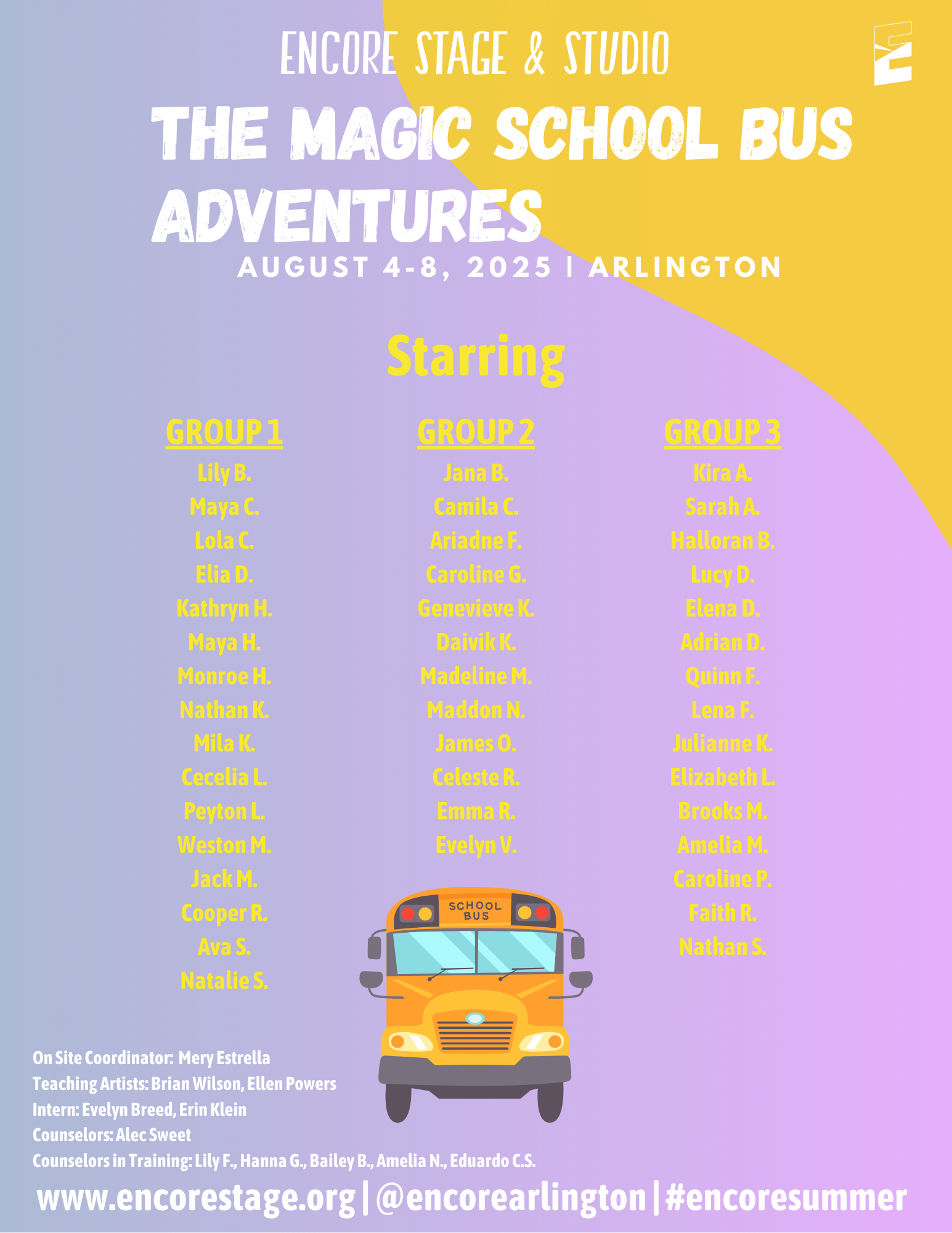 Discover the world of theatre through popular stories from the page and screen. Small groups of students will enjoy movement, theatre games, and crafts led by Encore’s Teaching Artists. We are excited to provide an opportunity for students to learn about theatre arts and activate their creativity!